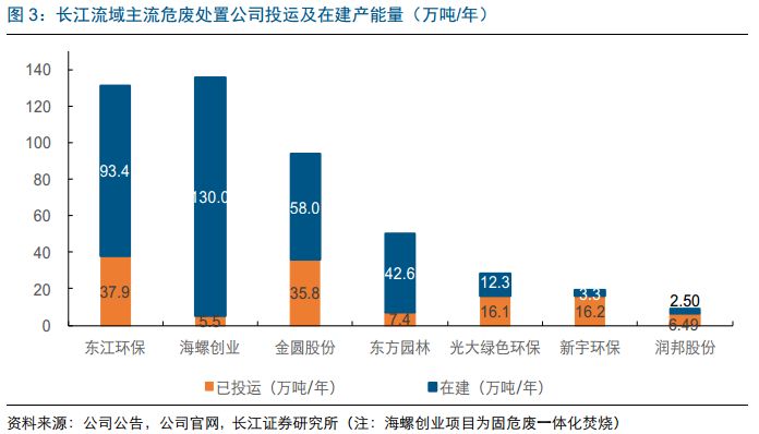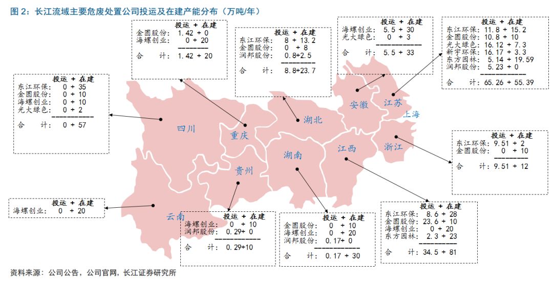 目前市場主流危廢企業(yè)包括東江環(huán)保/金圓股份/海螺創(chuàng)業(yè)/光大綠色環(huán)保/新宇環(huán)保/東方園林/潤邦股份,我們對這些企業(yè)在長江流域附近已投運和籌/在建項目進行梳理。