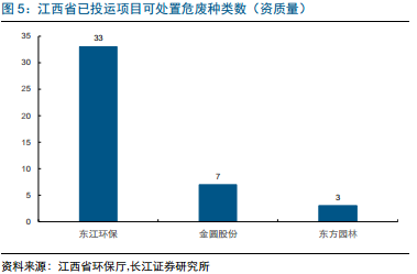 分省份來看,江蘇省項目分布最多,這可能和當地危廢產生量最大、華東地區(qū)危廢處置價格整體較高相關,業(yè)務競爭最為激烈;湖北、浙江中東江環(huán)保具有先發(fā)優(yōu)勢;江西省金圓股份控制的新金葉資源化產能較多(23.6萬噸/年),而無害化市場主要為東江環(huán)保(5萬噸/年);安徽省海螺創(chuàng)業(yè)為先行者;四川、湖南、云南、貴州暫無這幾個主流公司的項目投產,但在建產能較多,預計較快完成產能投運的公司將占取一定的優(yōu)勢。