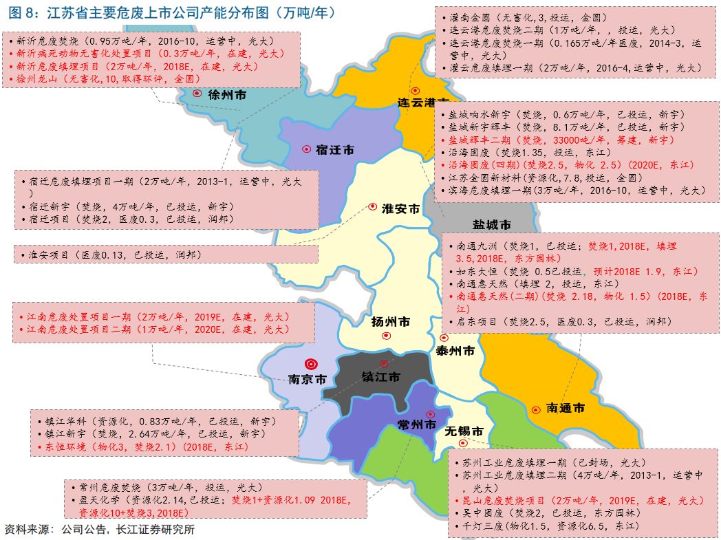 就江蘇省內來看,各個城市投運危廢產能最大上市企業(yè)分布,蘇州是光大綠色環(huán)保(4萬噸焚燒投運+2萬噸焚燒在建);常州是光大綠色環(huán)保(3萬噸焚燒投運);南通是潤邦股份(2.5萬噸焚燒+0.3萬噸醫(yī)廢投運);鹽城是新宇環(huán)保(8.7萬噸焚燒投運+3.3萬噸焚燒在建);連云港是光大綠色環(huán)保(3.2萬噸焚燒運營),南京是光大綠色環(huán)保(3萬噸在建),鎮(zhèn)江是新宇環(huán)保(3.47萬噸投運),徐州是光大綠色環(huán)保(0.96萬噸焚燒投運),宿遷市是新宇環(huán)保(4萬噸焚燒運營)。