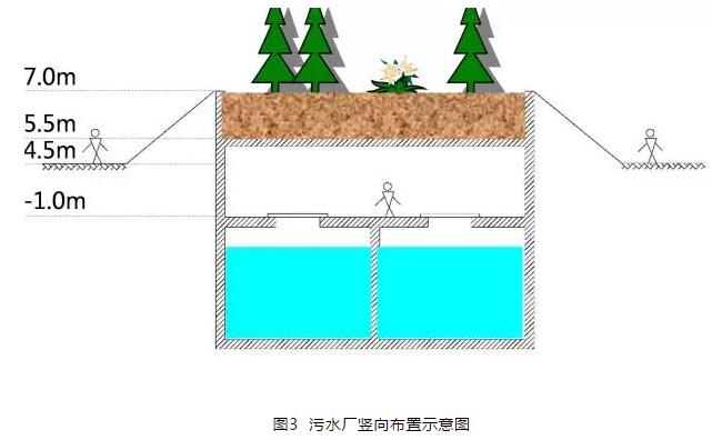泰和污水處理廠一體化箱體的豎向布置標(biāo)高綜合考慮工程投資、工程安全、進(jìn)出水水力銜接、環(huán)境協(xié)調(diào)和綠化景觀等方面的需求。污水廠周邊市政道路的設(shè)計(jì)地面標(biāo)高約4.50 m,一體化箱體的豎向布置采用箱體頂標(biāo)高高于周邊道路1 m的方案(箱體內(nèi)操作層標(biāo)高-1.00 m;箱體頂板標(biāo)高5.50 m),箱體分兩層,地下二層為水處理層,主要為鋼筋混凝土水池結(jié)構(gòu);地下一層為操作層,主要為框架結(jié)構(gòu),箱體頂部覆土厚度1.5 m實(shí)施綠化。污水廠的這個(gè)高程布置方案在滿足綠化景觀建設(shè)要求的前提下,通過適當(dāng)抬升豎向布置高程,既節(jié)省了工程造價(jià),也一定程度提升了工程實(shí)施及運(yùn)行的安全性。污水廠整體豎向布置如圖3所示。