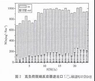 進入脫硝中試裝置的煙氣流量約為55m3/h,通過現(xiàn)場調(diào)試,選定催化劑層溫度為150℃進行脫硝中試。結(jié)合焦?fàn)t高負荷運行時的尾氣氮氧化物濃度,設(shè)定進入系統(tǒng)的氨氣流量為0.35L/min。中試裝置開啟2h后,催化劑層溫度上升并維持在150℃。由分析儀所得數(shù)據(jù)可計算出NOx去除率,即脫硝效率。圖2為反應(yīng)器進出口的NOx濃度,淺色柱的峰值對應(yīng)的是反應(yīng)器入口的NOx濃度,深色柱的高度為反應(yīng)器出口的NOx濃度。圖3為與圖2相對應(yīng)的高負荷運行脫硝效率圖。