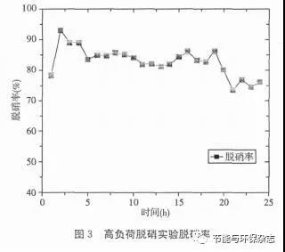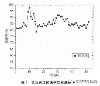 中試期間,由于焦化廠部分工段檢修,焦?fàn)t進入低負荷運行狀態(tài),尾氣中NOx濃度均值約500mg/Nm3,故對低負荷的煉焦尾氣進行連續(xù)脫硝中試。中試條件:進入脫硝中試裝置的煙氣流量55m3/h左右,催化劑層溫度150℃,進入系統(tǒng)的氨氣的流量0.2L/min。圖4為低負荷連續(xù)脫硝實驗脫硝率圖,圖示連續(xù)脫硝實驗運行時間為52小時。脫硝率在78%~98%范圍內(nèi),運行期間催化劑活性未出現(xiàn)減弱趨勢,實驗結(jié)果顯示選用的低溫催化劑可用于焦化煙氣的連續(xù)脫硝,并維持高的脫硝率。