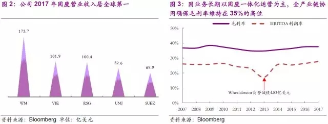 截止2018年5月23日,WM市值達(dá)357億美元。公司2017年垃圾處理量高達(dá)1.13億噸,實(shí)現(xiàn)營業(yè)收入145億美元,EBIT和EBITDA分別為26和40億美元。公司2017年固廢營業(yè)收入居全球第一,領(lǐng)先第二名威立雅達(dá)70%,而這一切都建立在公司僅在美國和加拿大運(yùn)營的基礎(chǔ)上,充分展現(xiàn)出公司在固廢領(lǐng)域的絕對統(tǒng)治力。