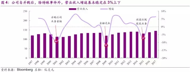 公司在1998年底合并后便堅決的采用了收益導(dǎo)向策略來優(yōu)化公司業(yè)務(wù)結(jié)構(gòu),首當(dāng)其沖調(diào)整的便是海外業(yè)務(wù)。北美外業(yè)務(wù)是助力公司成為全球最大固廢公司的核心驅(qū)動之一,為公司帶來了可觀的營業(yè)收入。但是隨著競爭的逐步加大,北美外業(yè)務(wù)的營業(yè)利潤逐步下滑。公司僅用2年時間便基本完成了海外業(yè)務(wù)的剝離,這一切還是發(fā)生在美國和加拿大營業(yè)收入同步下滑的基礎(chǔ)上,可見公司的決心。更值得稱道的是,2年間公司營業(yè)利潤實(shí)現(xiàn)了明顯增長,股價也隨之走高,充分體現(xiàn)出了收益導(dǎo)向策略的成功之處。