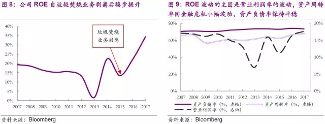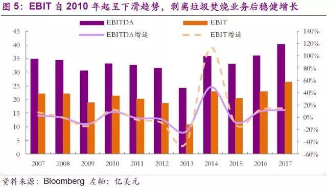 由于金融危機(jī)和垃圾焚燒電價下降等多重因素共同作用,公司ROE自2007年起逐步走低。隨著多個長期垃圾焚燒發(fā)電合同的到期,公司需要重新按照市場價格續(xù)簽合同,經(jīng)過慎重評估后,公司在2013年確認(rèn)了高達(dá)4.83億美元的Wheelabrator公司商譽(yù)減值,在營業(yè)收入略有增長的情況下,將公司EBIT從2012年的18.5億美元直線拉低至10.8億美元,帶動公司營業(yè)利潤率跌破10%,ROE也降到不足2%。雖然2014年Wheelabrator營業(yè)收入有所增長,但是站在公司長期戰(zhàn)略性角度考慮,垃圾焚燒業(yè)務(wù)已不再屬于公司核心業(yè)務(wù)。公司最終于2014年正式出售Wheelabrator子公司及其全部垃圾焚燒業(yè)務(wù)。經(jīng)過2015年的剝離陣痛后,公司營業(yè)利潤率和ROE重新回到歷史高位。