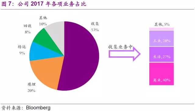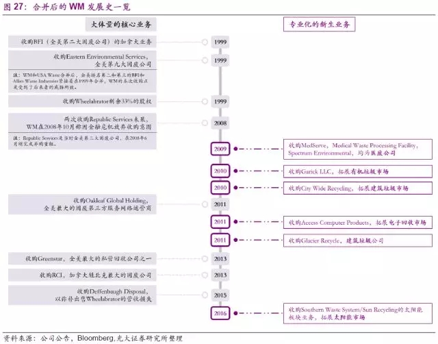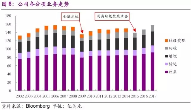 公司核心業(yè)務(wù)在美國已占據(jù)領(lǐng)先地位,合并后,公司先是迅速拿下了BFI(全美第二大固廢公司)的加拿大全部業(yè)務(wù),緊接著又收購了全美第九大固廢公司Eastern Environmental Services。公司在穩(wěn)固開展自有優(yōu)勢垃圾收運(yùn)業(yè)務(wù)的基礎(chǔ)上,先是在1999年收購公司垃圾焚燒領(lǐng)域支柱Wheelabrator的剩余33%股權(quán),隨后分別在2011年、2013年收購全美最大的固廢第三方服務(wù)運(yùn)營商Oakleaf Global Holding和私營回收公司Greenstar,穩(wěn)固提高公司在垃圾收運(yùn)、垃圾轉(zhuǎn)運(yùn)、以及垃圾回收等核心業(yè)務(wù)上的領(lǐng)先地位。