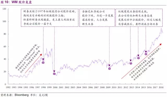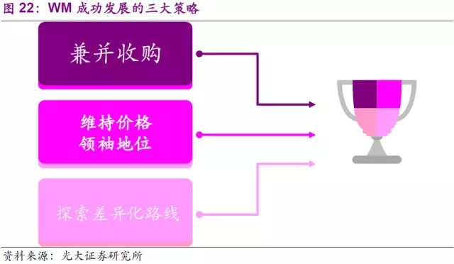 縱觀WM發(fā)展的歷史,它既享受到外部經(jīng)濟(jì)和行業(yè)高速發(fā)展所帶來的廣闊市場,也需經(jīng)歷經(jīng)濟(jì)危機(jī)和市場轉(zhuǎn)型所帶來的陣痛。公司為搶占市場份額,穩(wěn)固龍頭地位,實(shí)現(xiàn)股東最大化方面做出了多方面努力,制定了各類執(zhí)行策略以期達(dá)到目標(biāo),而我們認(rèn)為其中最重要的是三項(xiàng)策略,也是我們將進(jìn)一步細(xì)致分析的,即兼并收購,維持價格領(lǐng)袖地位,以及探索差異化路線。