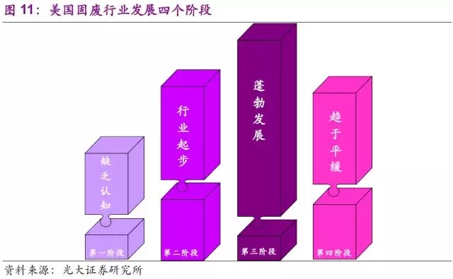 美國固廢行業(yè)伴隨著美國整體的經(jīng)濟(jì)的發(fā)展變化經(jīng)歷了“缺乏認(rèn)知”(兩次工業(yè)革命—1930s),“行業(yè)起步”(1930s—二戰(zhàn)結(jié)束),“蓬勃發(fā)展”(二戰(zhàn)結(jié)束—1980s)和“趨于平緩”(1980s—至今)的四個階段。經(jīng)過比較分析,我們認(rèn)為第三第四階段更貼合中國的實(shí)際并且可以發(fā)掘出參考意義,所以我們將著重描述“蓬勃發(fā)展”和“趨于平緩”兩個階段。
