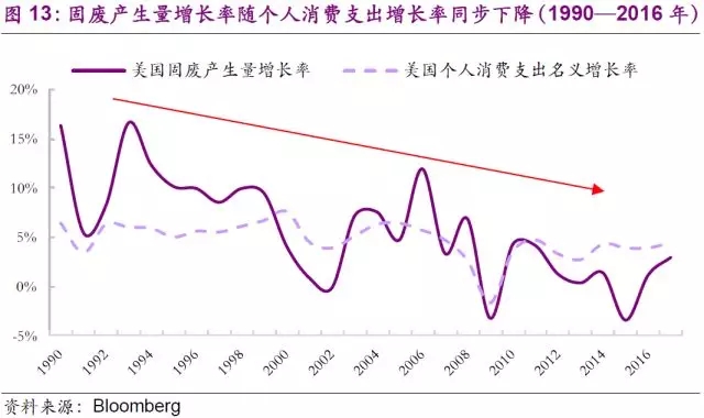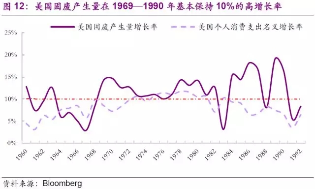二戰(zhàn)后,美國新技術(shù)革命的推動(主要原因)與國民經(jīng)濟(jì)的軍事化(越南戰(zhàn)爭)極大地刺激了經(jīng)濟(jì)的增長。利用戰(zhàn)后經(jīng)濟(jì)優(yōu)勢地位和國外廉價資源(石油等),美國的現(xiàn)代跨國公司大力拓展世界市場,極大地獲取高額利潤,使得美國國內(nèi)經(jīng)濟(jì)持續(xù)發(fā)展,西部和南部呈現(xiàn)繁榮之象并且造就了一個黃金時代。高速發(fā)展的黃金時期,美國居民生活水平持續(xù)提高,個人消費(fèi)增速明顯,進(jìn)而帶動固廢量持續(xù)走高,這段時期也是固廢行業(yè)蓬勃發(fā)展的第三階段。