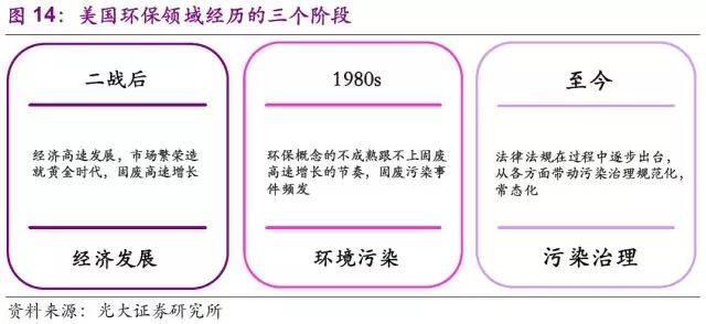 和其他發(fā)達(dá)國家一樣,美國在環(huán)保領(lǐng)域同樣經(jīng)歷了“經(jīng)濟(jì)發(fā)展—環(huán)境污染—污染治理”這一過程,而這三者之間的脈絡(luò)基本對應(yīng)固廢行業(yè)的第三,四階段。在這兩個階段之前美國出臺的一系列法規(guī),先后幫助固廢行業(yè)的完善成長以及促使其朝著平穩(wěn)可持續(xù)健康的發(fā)展業(yè)態(tài)前進(jìn)。
