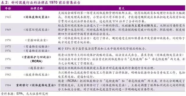 雖然以上法律法規(guī)的頒布和公司所處的固廢行業(yè)并無太大的關(guān)聯(lián),但這段時期環(huán)保領(lǐng)域法律法規(guī)的密集出臺,拉開了美國政府正式通過行政干預(yù)環(huán)境治理以及扶持環(huán)保產(chǎn)業(yè)崛起的序幕,對固廢行業(yè)的發(fā)展打下了堅實(shí)的基礎(chǔ)。