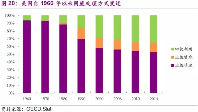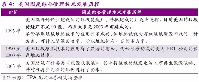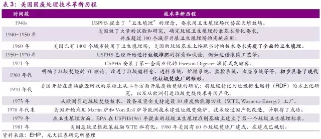 固廢行業(yè)的技術(shù)發(fā)展同樣是制約市場和公司發(fā)展的另一個決定性因素。早在1940年,美國公共衛(wèi)生署(USPHS)便開始推行了一系列固廢處置的技術(shù)性試驗(yàn),從“衛(wèi)生填埋代替露天堆放”,到“垃圾堆肥的探索和試驗(yàn)”,再到“垃圾焚燒”,最后到了如今大力推廣的“廢物能源回收”的綜合利用。