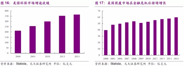 隨著環(huán)保處置設(shè)施要求的日益提升,環(huán)保市場也在穩(wěn)步擴(kuò)大。美國環(huán)保市場從2000年的2090億美元發(fā)展到2015年的3631億美元,但增速近年來有所放緩。固廢市場在2009年受金融危機(jī)影響有所下滑后,重回增長軌道。