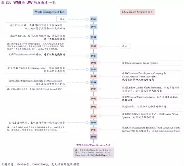 縱觀WM的發(fā)展史,兼并和收購一直貫穿其中。改變公司歷史的一次兼并發(fā)生在1998年,公司與USA Waste Services Inc.(以下簡稱UW)合并,新公司名稱保留為Waste Management。值得注意的是,本次兼并的提出方并不是當(dāng)時全美第一的固廢龍頭WM提出,而是由當(dāng)時全美第三的UW提出兼并,同時新公司的CEO也由原UW的CEO擔(dān)任。為了更好的分析WM的并購發(fā)展,我們將分別研究WM(合并后),原WM(以下簡稱WMI),以及UW分別的發(fā)展并購史。