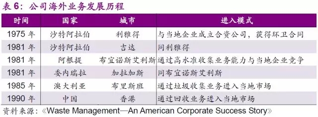 在美國成功擴(kuò)張的同時,WMI也抓住了在國際市場上發(fā)展的機(jī)遇。1975年,公司通過與當(dāng)?shù)仄髽I(yè)成立合資公司的方式,成功的打開了沙特首都利雅得的環(huán)衛(wèi)市場,這也是世界上第一個跨國的環(huán)衛(wèi)合同。這個合同的示范效應(yīng)給了WMI世界范圍的關(guān)注。1980年,公司先后成功進(jìn)入了阿根廷、委內(nèi)瑞拉、澳大利亞、部分歐洲國家,以及香港的危廢及環(huán)衛(wèi)市場,并于1990年成為了世界最大的固廢龍頭。