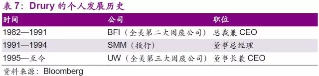 值得一提的是UW高速發(fā)展的源動力,公司CEO John E.Drury。作為Browning-Ferris Industries(以下簡稱“BFI”)的總裁兼COO,Drury用了10年時間引領(lǐng)BFI成為全美第二大固廢公司的位置,然而因?yàn)椴唤邮芄綜EO大力發(fā)展垃圾回收行業(yè)的決定,離開公司并于1994年擔(dān)任UW的CEO。Drury僅花了3年時間,通過1995年的5次大型收購,以及1996年的30次小型收購,將公司的營業(yè)收入從1994年的434萬美元大幅增長至1997年的26億美元,增速高達(dá)598倍。
