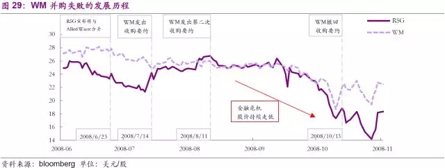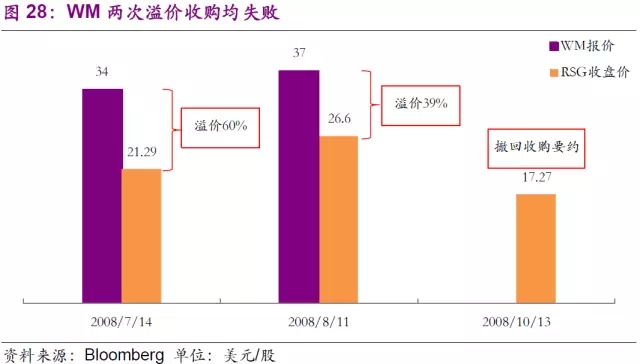 值得注意的是公司發(fā)起收購的時間。2008年6月23日,RSG宣布將與Allied Waste合并,而當(dāng)時Allied Waste和RSG分別是美國第二、第三大固廢公司。消息宣布后一個月內(nèi),WM就向RSG提出了收購要約,但未能實(shí)現(xiàn)。