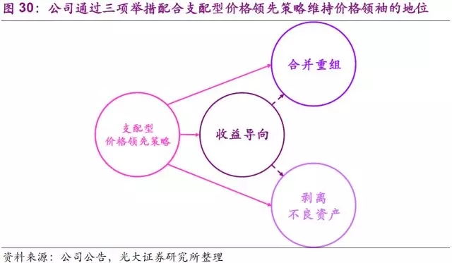 價格領(lǐng)袖是指經(jīng)由同業(yè)的龍頭公司現(xiàn)行制定產(chǎn)品某一期間內(nèi)的價格后,其它公司根據(jù)制定的價格,就其同質(zhì)產(chǎn)品確定其價格。行業(yè)的競爭對手如果期望維持已有的市場份額,只能與領(lǐng)先公司制定的價格相匹配。WM在通過兼并收購占據(jù)統(tǒng)治性的市場份額后,利用龍頭地位果斷選擇了支配型價格領(lǐng)先策略,進(jìn)一步通過“收益導(dǎo)向策略”、“合并重組”、“剝離不良資產(chǎn)”這三項(xiàng)舉措的實(shí)施維持其價格領(lǐng)袖的地位。