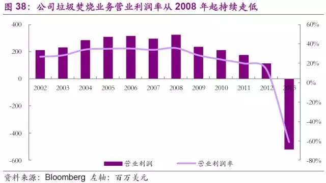一步分析,Wheelabrator營業(yè)收入走低的核心因素是垃圾焚燒發(fā)電上網(wǎng)電價的持續(xù)下跌。再加上Wheelabrator原來簽訂的數(shù)個高于現(xiàn)上網(wǎng)電價的長期合同到期,需要按現(xiàn)行電價重新續(xù)簽,公司認(rèn)為Wheelabrator已無法為公司提供穩(wěn)定的收益,并在2013年確認(rèn)了高達(dá)4.83億美元的商譽(yù)減值,隨后于2014年宣布剝離Wheelabrator的全部業(yè)務(wù)。