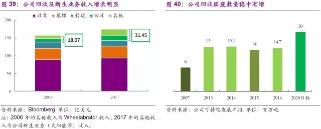 隨著固廢傳統(tǒng)市場業(yè)務(wù)趨于飽和,公司也在積極求變。一方面,公司利用自有團(tuán)隊(duì)積極研發(fā)已有業(yè)務(wù)的轉(zhuǎn)型,另一方面,公司先后在2009至2016年,通過多次收購成熟的專業(yè)化新生公司,拓展了醫(yī)廢、有機(jī)垃圾、建筑垃圾、電子回收等市場,并取得了一定成績。需要注意的是,公司的以上收購雖涉及不同細(xì)分領(lǐng)域,但核心觀念一致,即加大資源回收再利用,這也契合美國固廢市場的轉(zhuǎn)型,進(jìn)一步優(yōu)化完善固廢處理全產(chǎn)業(yè)鏈發(fā)展。