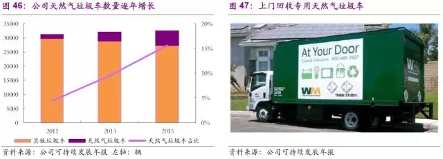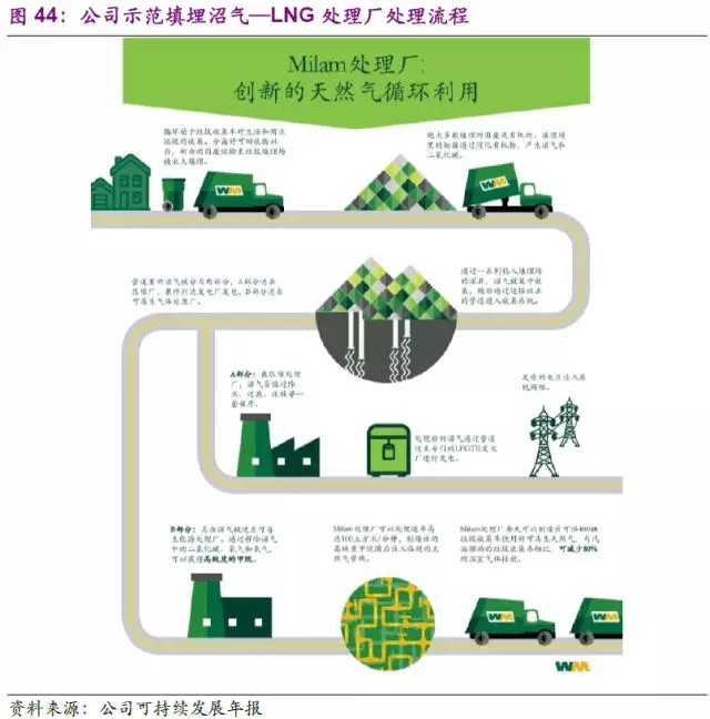 在此基礎(chǔ)上,公司也在領(lǐng)先研究填埋沼氣—天然氣的市場化進(jìn)程。公司先是于2005年在加州建立了全球最大的填埋沼氣—LNG處理廠,隨后分別于2014和2016年在俄亥俄州和伊利諾伊州建立了兩座填埋沼氣—壓縮天然氣處理廠。上述天然氣的產(chǎn)出在兩方面得到利用:一是用于公司自有的垃圾收集車(40%),二是進(jìn)入天然氣管網(wǎng)銷售,在降低公司運(yùn)營成本的同時也提供了一定營收。
