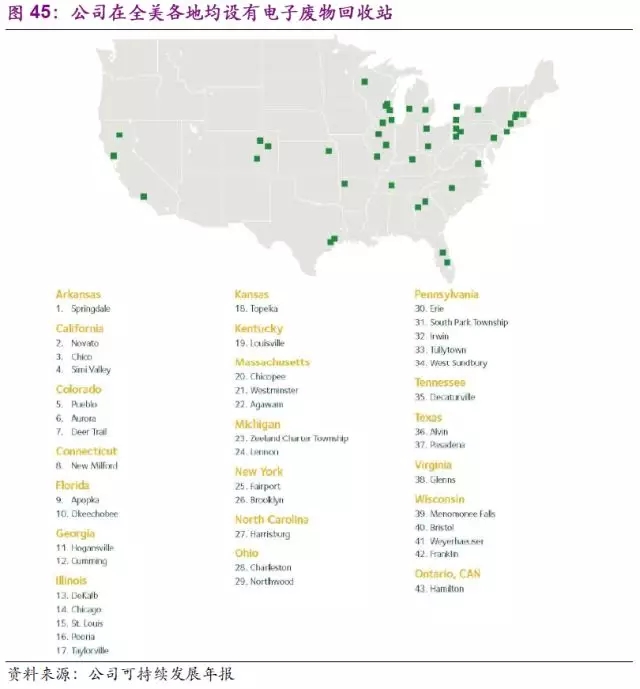 在電子廢物回收業(yè)務(wù)加速發(fā)展的同時,其他危廢處理也是公司關(guān)注的重點(diǎn)。公司的“At Your Door Special CollectionSM”正是專門為居民用戶處理危廢而推出的一站式服務(wù)。包括車用產(chǎn)品、電池、園林化學(xué)物質(zhì)、特別是熒光燈等危廢均可通過公司專用的危廢收集車上門收取。公司的固廢收集車(包括危廢)也是公司的一大亮點(diǎn),截止2016年,已有多達(dá)18500輛使用天然氣驅(qū)動,在為環(huán)保服務(wù)的同時也真正做到了自我環(huán)保價值的體現(xiàn)。