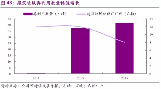 早在2000年初,公司便積極發(fā)展建筑垃圾的回收工作。公司在2009年至2014年間,通過10余家建筑垃圾回收廠占據(jù)了穩(wěn)定市場份額,建筑行業(yè)的季節(jié)性高峰特性也為公司在夏季的營業(yè)收入做出了可觀貢獻(xiàn)。而在2011年,公司又創(chuàng)新式的推出了“分散回收跟蹤工具”,通過跟蹤使用在工程中的重復(fù)利用建筑材料,幫助工程項(xiàng)目方更好地完成綠色建筑的目標(biāo)。截止2015年,通過跟蹤工具的幫助,已有多達(dá) 41萬噸的建筑垃圾得到回收或再利用,比2013年的37萬噸增長10%。