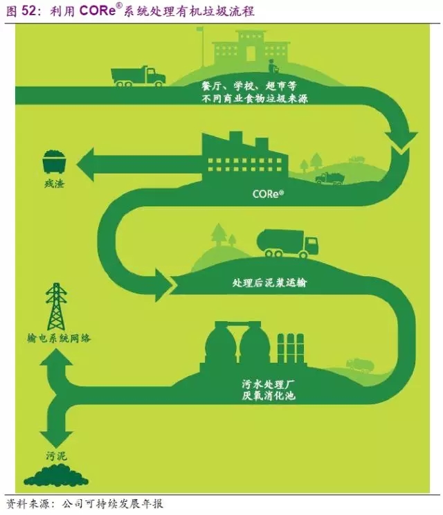 公司還在傳統(tǒng)堆肥處理有機(jī)垃圾的基礎(chǔ)上進(jìn)行了新技術(shù)的研發(fā)。公司在2013年新研發(fā)的有機(jī)廢物集中回收系統(tǒng)(CORe®),通過對商業(yè)食物垃圾的處理,制成泥漿后送至污水處理廠的厭氧消化池,可以提升多達(dá)70%的厭氧消化的能量產(chǎn)生量。公司在2015年已有3家處理廠使用CORe®系統(tǒng)處理8000噸的商業(yè)食物垃圾,未來仍有擴(kuò)張計劃。