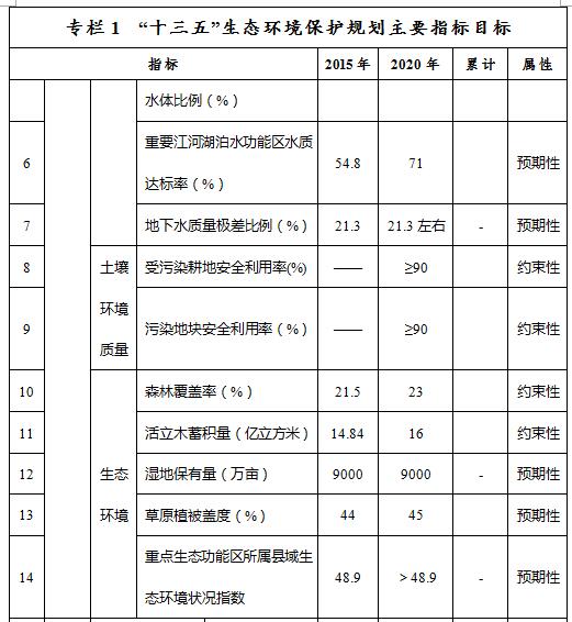 ——環(huán)境質量控制目標指標。到2020年,大氣環(huán)境質量方面,地級及以上城市空氣質量全年達標天數比例平均達到83.8%以上,重度及以上污染天數比例下降25%,未達標地級及以上城市PM2.5年均濃度下降12%。水環(huán)境質量方面,全區(qū)地表水質量考核斷面水質達到或優(yōu)于Ⅲ類比例總體達到59.6%,劣Ⅴ類水質比例控制在3.8%,重要江河湖泊水功能區(qū)水質達標率達到71%,全區(qū)地下水質量考核點位水質級別保持穩(wěn)定且極差比例控制在21.3%。土壤環(huán)境質量方面,全區(qū)土壤環(huán)境質量總體保持穩(wěn)定,農用地和建設用地土壤環(huán)境安全得到基本保障,受污染耕地安全利用率和污染地塊安全利用率均達到90%以上。生態(tài)環(huán)境質量方面,森林覆蓋率達23%,活立木蓄積量達16億立方米,濕地保有量達9000萬畝,草原植被蓋度達到45%,重點生態(tài)功能區(qū)所屬縣域生態(tài)環(huán)境狀況指數達到48.9以上。