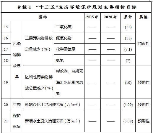 ——污染物排放總量控制目標。到2020年,全區(qū)化學需氧量、氨氮、二氧化硫和氮氧化物排放總量分別控制在77.66萬噸、4.37萬噸、109.56萬噸和101.37萬噸以內,比2015年的83.56萬噸、4.69萬噸、123.09萬噸和113.88萬噸分別減少7.1%、7%、11%和11%。呼倫湖、烏梁素海匯水范圍內總氮減少10%。