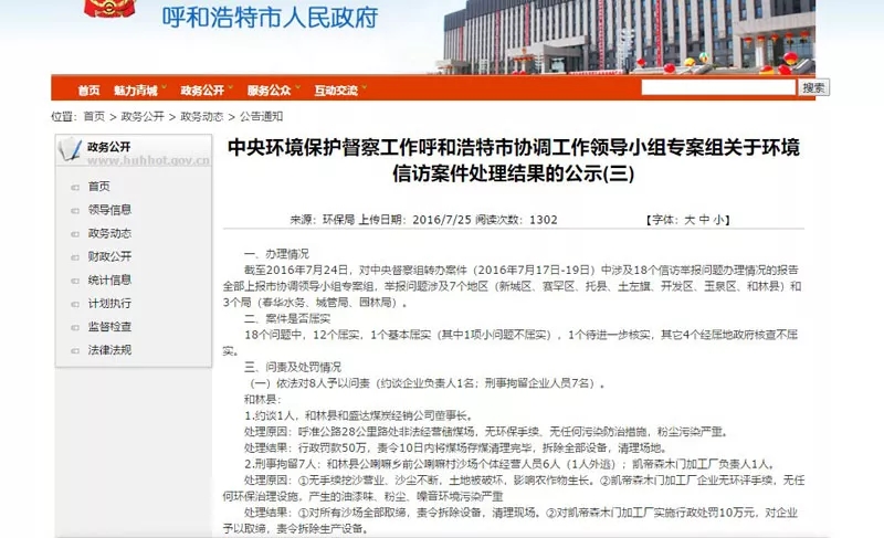 在呼和浩特市人民政府網(wǎng)站的政務(wù)公開一欄中,督察人員查閱到標(biāo)題為《中央環(huán)境保護(hù)督察工作呼和浩特市協(xié)調(diào)工作領(lǐng)導(dǎo)小組專案組關(guān)于環(huán)境信訪案件處理結(jié)果的公示(三)》的網(wǎng)頁(yè),其中清楚地顯示對(duì)凱帝森木門加工廠的問責(zé)及處罰情況?!皠P帝森木門加工廠企業(yè)無環(huán)評(píng)手續(xù),無任何環(huán)保治理設(shè)施,產(chǎn)生的油漆味、粉塵、噪音環(huán)境污染嚴(yán)重”。處理結(jié)果是“對(duì)凱帝森木門加工廠實(shí)施行政處罰10萬(wàn)元,對(duì)企業(yè)予以取締,責(zé)令拆除生產(chǎn)設(shè)備”。