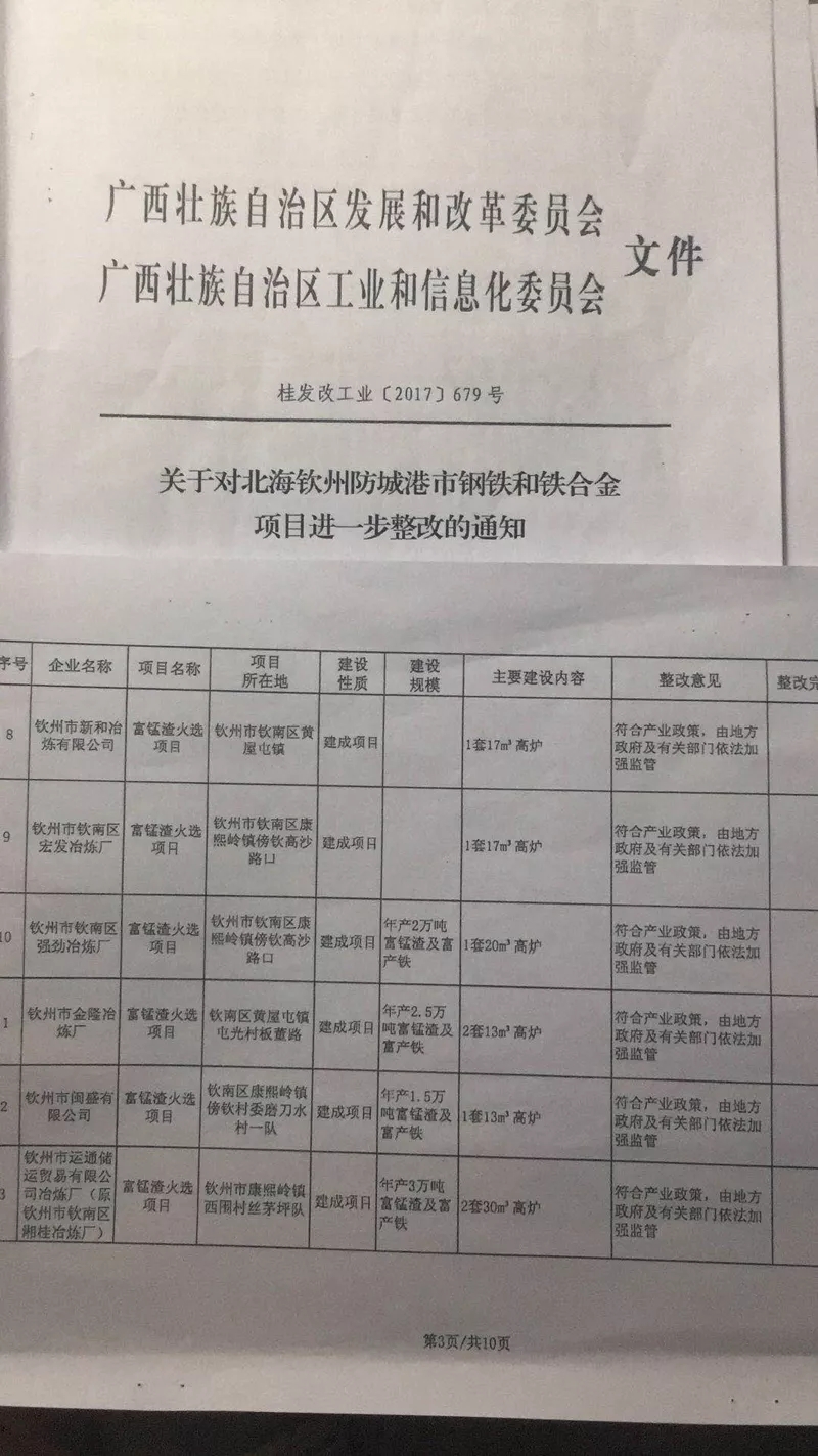 2017年1月,自治區(qū)發(fā)改委、工信委聯(lián)合發(fā)文開展沿海三市鋼鐵和鐵合金項(xiàng)目清理整頓;2017年3月,兩委針對(duì)清理整頓情況聯(lián)合開展集中督查;2017年6月1日,兩委再次聯(lián)合發(fā)文要求沿海三市進(jìn)一步開展鋼鐵和鐵合金項(xiàng)目整改。2017年6月23日,欽州市發(fā)改委、工信委聯(lián)合上報(bào)文件稱已在當(dāng)年6月10日前完成了清理整治,拆除了2家企業(yè)不符合產(chǎn)業(yè)政策的生產(chǎn)設(shè)備。欽州市政府和自治區(qū)發(fā)改委、工信委分別于2017年6月、7月、12月先后向社會(huì)公示問題已整改到位。