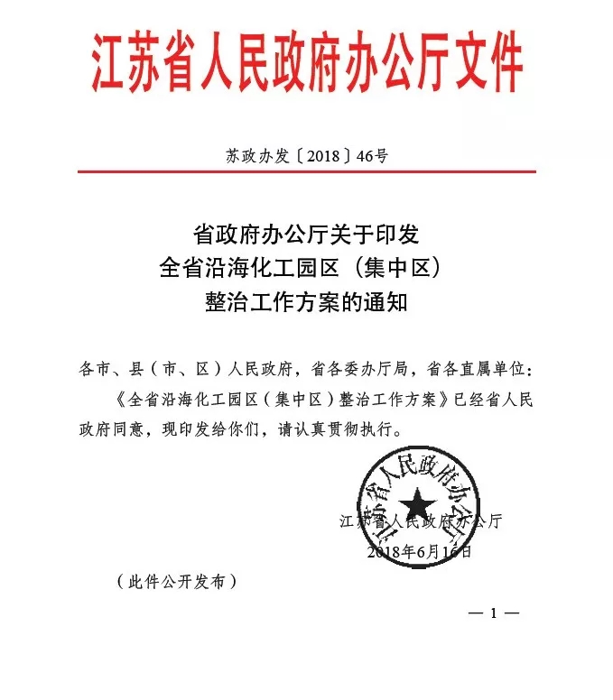 日前,江蘇省辦公廳印發(fā)了《全省沿?;@區(qū)(集中區(qū))整治工作方案的通知》(蘇政辦發(fā)【2018】46號,下稱46號文),文件要求對沿海地區(qū)南通、連云港、鹽城三市轄區(qū)內(nèi)所有化工園區(qū)及園區(qū)內(nèi)所有化工生產(chǎn)企業(yè)進行整治。另有消息稱,江蘇省環(huán)保廳也下發(fā)了復(fù)產(chǎn)通知,對園區(qū)和企業(yè)環(huán)保達標做出具體規(guī)定。