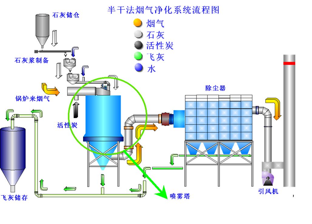 采用德國馬丁半干法煙氣凈化技術(shù),即“半干法噴霧塔+活性炭吸附+布袋除塵器” 工藝。