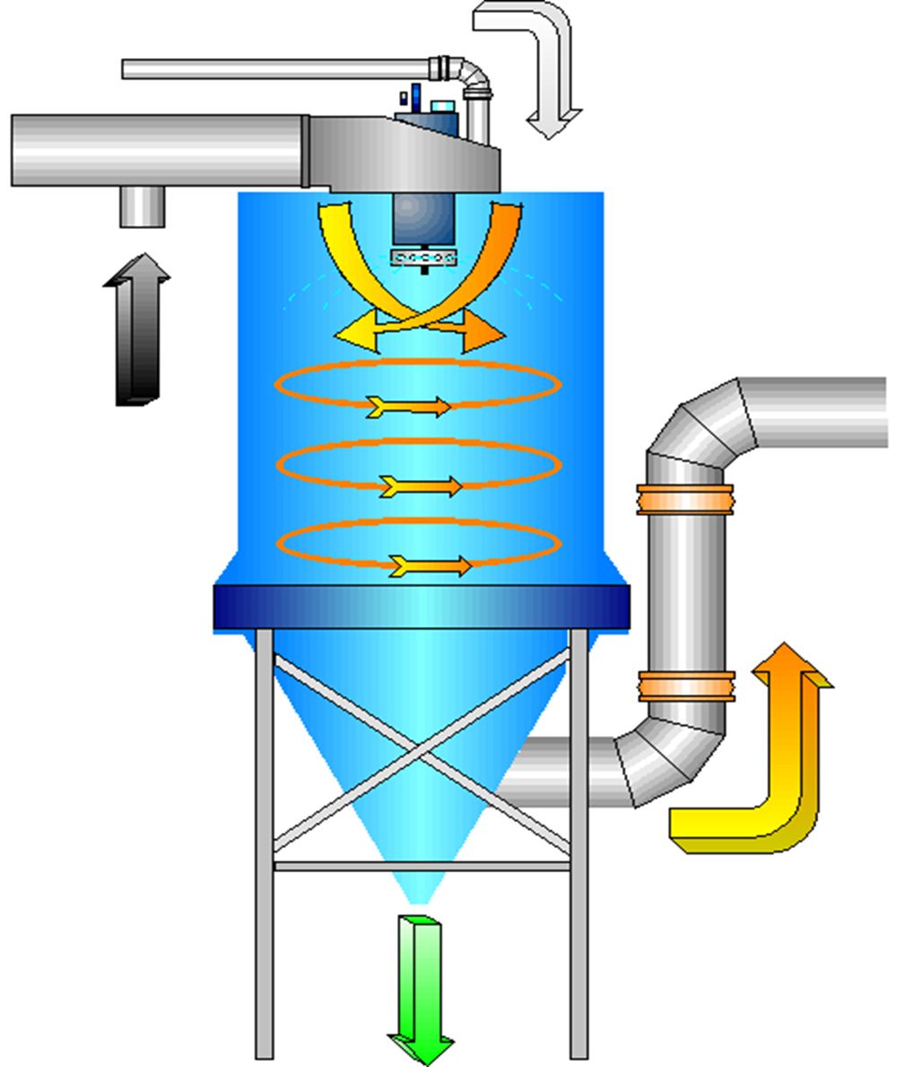 鍋爐出口溫度為210℃的煙氣自頂部導(dǎo)入噴霧塔,噴霧塔頂部導(dǎo)流片使煙氣進入噴霧塔后形成旋轉(zhuǎn)紊流流動,噴霧塔的頂部布置石灰漿液噴霧機,將石灰漿液粉碎成直徑為50微米以下的霧滴,以大大提高石灰漿液的比表面積和增加煙氣中酸性氣體分子與石灰漿液中氫氧化鈣分子接觸的面積和接觸的時間,以確保較高的反應(yīng)效率,酸性氣體與石灰漿液的反應(yīng)后生成粉塵顆粒,當煙氣從噴霧塔導(dǎo)出時隨著流向的改變,在離心力的作用下,有較多的粉塵脫離煙氣掉入灰斗。