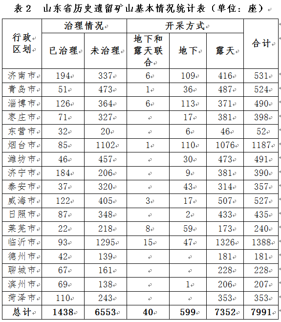 全省共有歷史遺留非煤礦山廢棄礦井1302處,主要涉及金、鐵、石膏、耐火粘土等礦種,主要分布于濟南、煙臺、威海、臨沂等地。