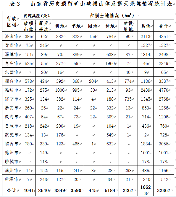 全省露天開采礦種主要有石灰?guī)r、花崗巖、磚瓦用粘土等非金屬建筑材料礦產,在開采過程中造成了地形地貌景觀破壞,也占壓和損毀了大量的土地資源。目前,全省尚有破損山體4706處、露天采坑3109處,占損土地資源總計4.28萬公頃。其中,歷史遺留礦山破損山體4041處、露天采坑2640處,占損土地資源3.24萬公頃,主要分布在濟南、煙臺、濰坊、臨沂等地(表3);生產礦山造成的破損山體665處、露天采坑469處,占損土地資源1.04萬公頃,主要分布在煙臺、泰安、臨沂等地。