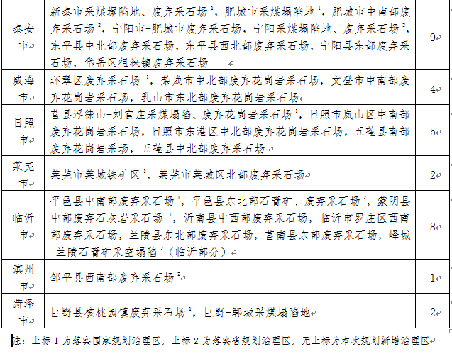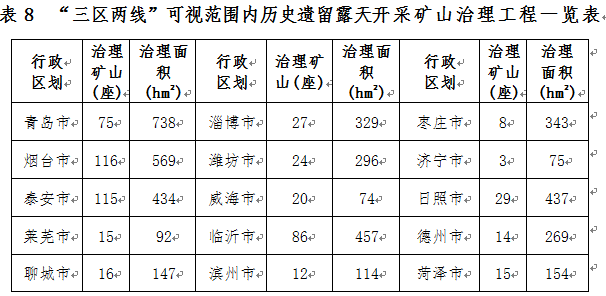 部署開展“三區(qū)兩線”可視范圍內歷史遺留露天開采礦山地質環(huán)境治理工程,到2020年治理歷史遺留露天開采礦山577座,治理面積0.45萬公頃,主要分布于青島、煙臺、泰安、日照、臨沂等地(表8)。