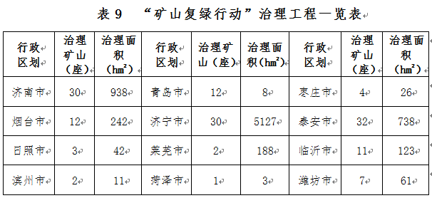 2013年全省編制實施了《山東省礦山復綠行動實施方案》,共確定治理礦山400座,目前已治理完成254座,146座未完成。部署到2020年治理礦山146座,治理面積0.75萬公頃(含采煤塌陷地0.44萬公頃,“三區(qū)兩線”可視范圍內歷史遺留礦山0.15萬公頃),主要分布于濟南、煙臺、濟寧、泰安等地(表9)。