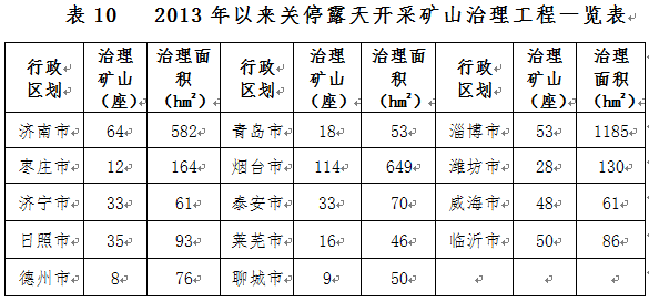 2013年以來全省關停露天開采礦山1539座,已治理礦山267座,未治理礦山1272座。部署到2020年治理礦山518座,治理面積0.33萬公頃(含“三區(qū)兩線”可視范圍內歷史遺留礦山0.09萬公頃),主要分布于濟南、淄博、煙臺等地(表10)。
