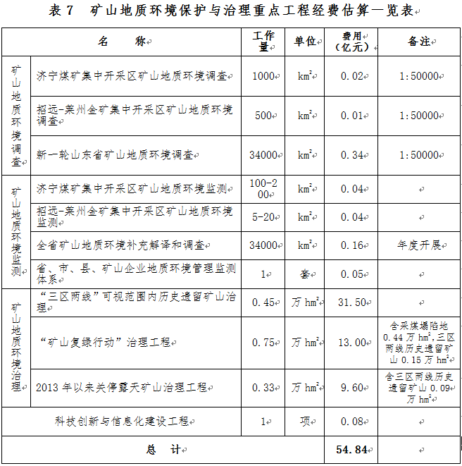 在濟寧煤礦集中開采區(qū)、招遠-萊州金礦集中開采區(qū)開展礦山地質環(huán)境專項調查,在全省開展新一輪礦山地質環(huán)境詳細調查。調查費用估算為0.37億元。
