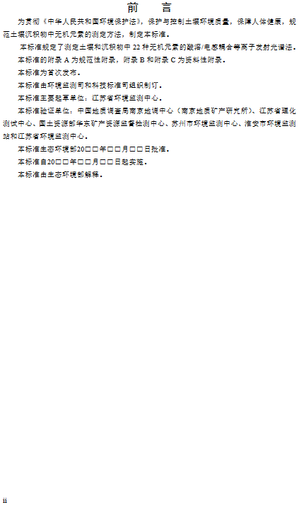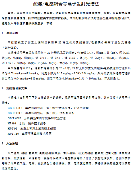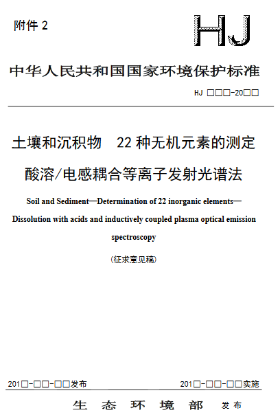 為貫徹《中華人民共和國(guó)環(huán)境保護(hù)法》,保護(hù)與控制土壤環(huán)境質(zhì)量,保障人體健康,規(guī)范土壤沉積物中無機(jī)元素的測(cè)定方法,生態(tài)環(huán)境部印發(fā)《土壤和沉積物 22種無機(jī)元素的測(cè)定 酸溶/電感耦合等離子發(fā)射光譜法(征求意見稿)》,詳情如下: