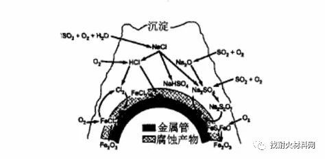垃圾焚燒中的堿金屬氧化物,也是鍋爐高溫腐蝕的一個(gè)重要因素。這些堿金屬氧化物與HCl反應(yīng),形成堿金屬氯化物,然后冷凝沉淀在表面。沉積鹽中基于金屬氯化物硫酸鹽化作用機(jī)制,可見以下化學(xué)反應(yīng)式: