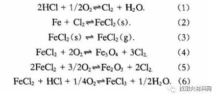 垃圾中塑料、橡膠和廚房廢料中都含有氯元素,例如聚氯乙烯廢物、聚偏二氯乙烯廢物、氯化丁基橡膠廢物、氯化鈉、氯化鉀等,這些有機(jī)和無機(jī)氯化物在高溫焚燒后都會(huì)產(chǎn)生HCl。垃圾焚燒廢氣中的氧的質(zhì)量分?jǐn)?shù)為5%?10%,而HCl的質(zhì)量濃度為800?4000mg/m3。高溫HCl的腐蝕機(jī)理目前報(bào)道較多的是活化氧化的機(jī)理,可見以下化學(xué)反應(yīng)式: