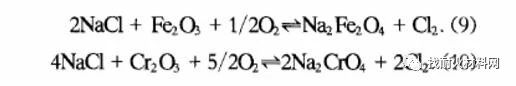 由反應(yīng)式(7)生成的HCl可以進(jìn)一步氧化成Cl2,從而進(jìn)一步腐蝕金屬,具體過程與HCl高溫腐蝕相似。高溫熔融的堿金屬氯化物亦可以與金屬氧化物反應(yīng),具體可見以下化學(xué)反應(yīng)式: