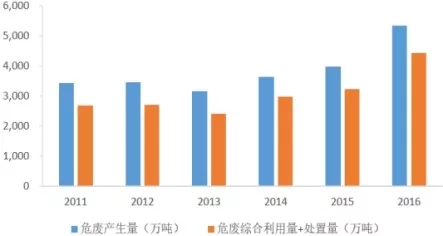 近年來危廢產(chǎn)量逐年上升,雖然危廢處置規(guī)模也在擴(kuò)大,但供需缺口要遠(yuǎn)比數(shù)據(jù)顯示的嚴(yán)峻。根據(jù)國家統(tǒng)計(jì)局?jǐn)?shù)據(jù),2016年我國共產(chǎn)生危險(xiǎn)廢物5347萬噸,較上年同期增長34.49%;但2016年危廢處置缺口達(dá)到917萬噸,由于危廢產(chǎn)生量是通過企業(yè)申報(bào)數(shù)據(jù)統(tǒng)計(jì)的,往往較實(shí)際情況要低的多。此外,由于危廢處置實(shí)際產(chǎn)能也要低于經(jīng)營許可證產(chǎn)能,危廢處置實(shí)際缺口要遠(yuǎn)高于統(tǒng)計(jì)水準(zhǔn)。