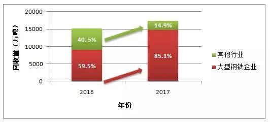 由于國家取締“地條鋼”力度加強(qiáng),越來越多的廢鋼鐵通過正規(guī)渠道進(jìn)入大型鋼廠。2017年大型鋼鐵企業(yè)廢鋼鐵回收量同比增長64.2%,所占廢鋼鐵回收總量比例增至85.1%。