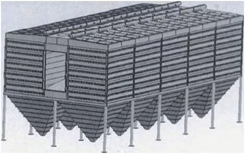 將原窯頭電除塵器三電場(chǎng)全部拆除,保留電除塵器的大梁,采取頂部出風(fēng)高凈氣室的設(shè)計(jì)方式。充分利用原有電除塵器的外殼體(含灰斗、立柱、框架、箱體等)以及輸送系統(tǒng),拆除電除塵器的頂部及內(nèi)部構(gòu)件,將原有電除塵器各個(gè)電場(chǎng)的每側(cè)改為三個(gè)袋室,改造后除塵器共分為12個(gè)袋室。將濾袋布滿設(shè)備內(nèi)部,并改變除塵設(shè)備出口方式,增設(shè)頂部上箱體(含爬梯和頂部噴吹凈氣室),將其整體改造為純袋式除塵器。