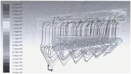 利用CAE技術(shù)對(duì)設(shè)備內(nèi)部進(jìn)行CFD流場(chǎng)模擬分析(見(jiàn)圖5),以此結(jié)合新型均風(fēng)結(jié)構(gòu)(已獲國(guó)家實(shí)用新型專利)來(lái)改善內(nèi)部氣流分布,進(jìn)一步降低設(shè)備結(jié)構(gòu)阻力。