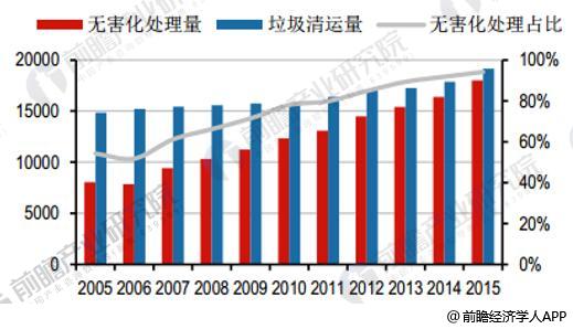 截至2015年底,全國城市范圍內(nèi)生活垃圾焚燒占比已達(dá)37.97%,其余城市生活垃圾以衛(wèi)生填埋或其它形式進(jìn)行無害化處理。2005年至2015年的十年間,我國生活垃圾清運(yùn)量及無害化處理率不斷提高,焚燒占無害化處理的比重增長超過3倍。